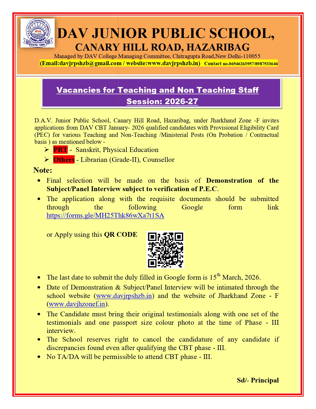 DAV Staff Recruitment: Phase -III (Demo & Interview ) Session 2026 -27